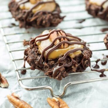These No Bake Turtle Cookies start with chocolate oatmeal no bake cookies topped with thick caramel, pecans, and a drizzle of chocolate! Perfect for Christmas baking. Includes step by step recipe video.