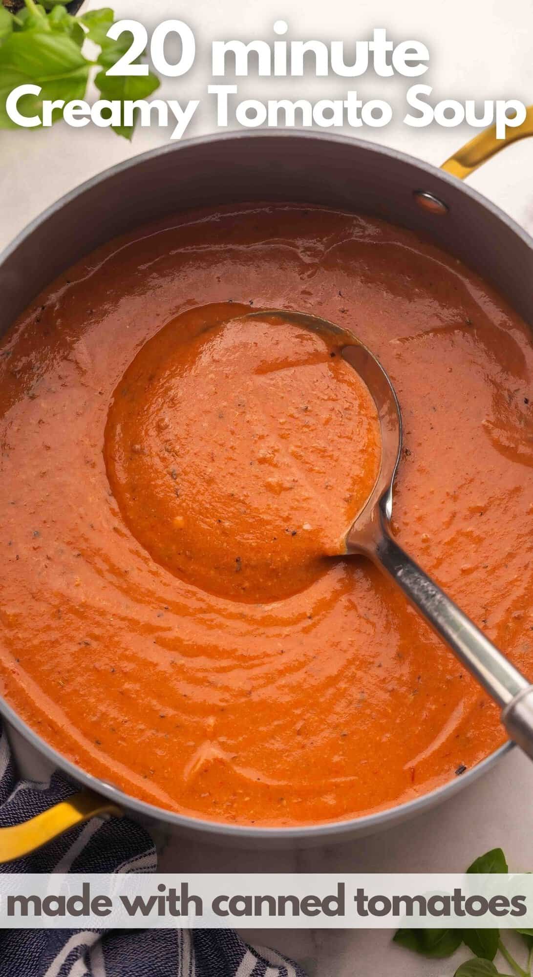 This Creamy Tomato Soup is made in 20 minutes with canned tomatoes, but no one would ever know! It’s flavored with basil, garlic and Parmesan and perfect for dunking your grilled cheese!