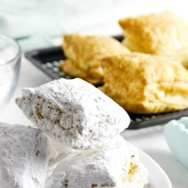 Easy 2 ingredient Air Fryer Beignets! Made with buttery puff pastry and coated with powdered sugar with no oil! Ready in 9 minutes!