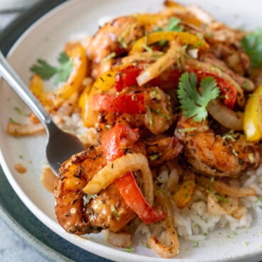 Air Fryer Shrimp And Peppers cooked quickly in the air fryer, then covered in a silky coconut curry sauce. Easily your new weeknight go-to!