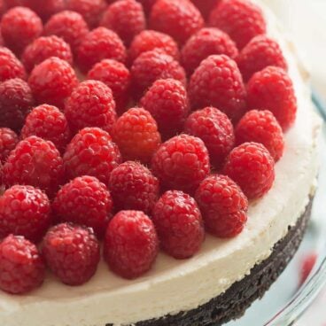 This Brownie Bottom Cheesecake is made with a fudgy, brownie base, a silky smooth no bake cheesecake and topped with piles of fresh raspberries. It’s an elegant holiday dessert that’s also naturally gluten free!