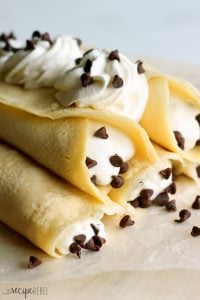 Soft homemade crepes filled with sweet ricotta cream and chocolate chips, topped with whipped cream and more chocolate chips. A breakfast version of an Italian favorite!