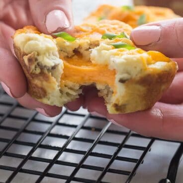 - Stir in eggs until completely combined. Spoon enough into each of the 12 muffin cups to cover the bottom. Place one cube of cheese in the center of each (don’t push down!) muffin cup. Cover with enough potatoes to hide the cube of cheese. Sprinkle the tops with remaining cheese.