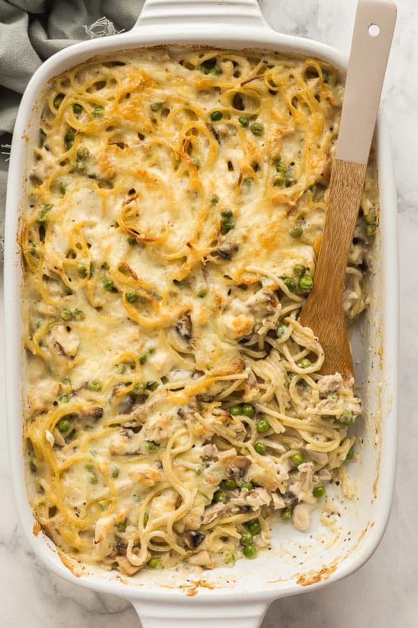 - Swap your vegetables: You can leave out the peas and mushrooms or keep them and add your favorites. Any vegetables you add should be cooked (or at least par-cooked) before you add them to the tetrazzini and before baking.