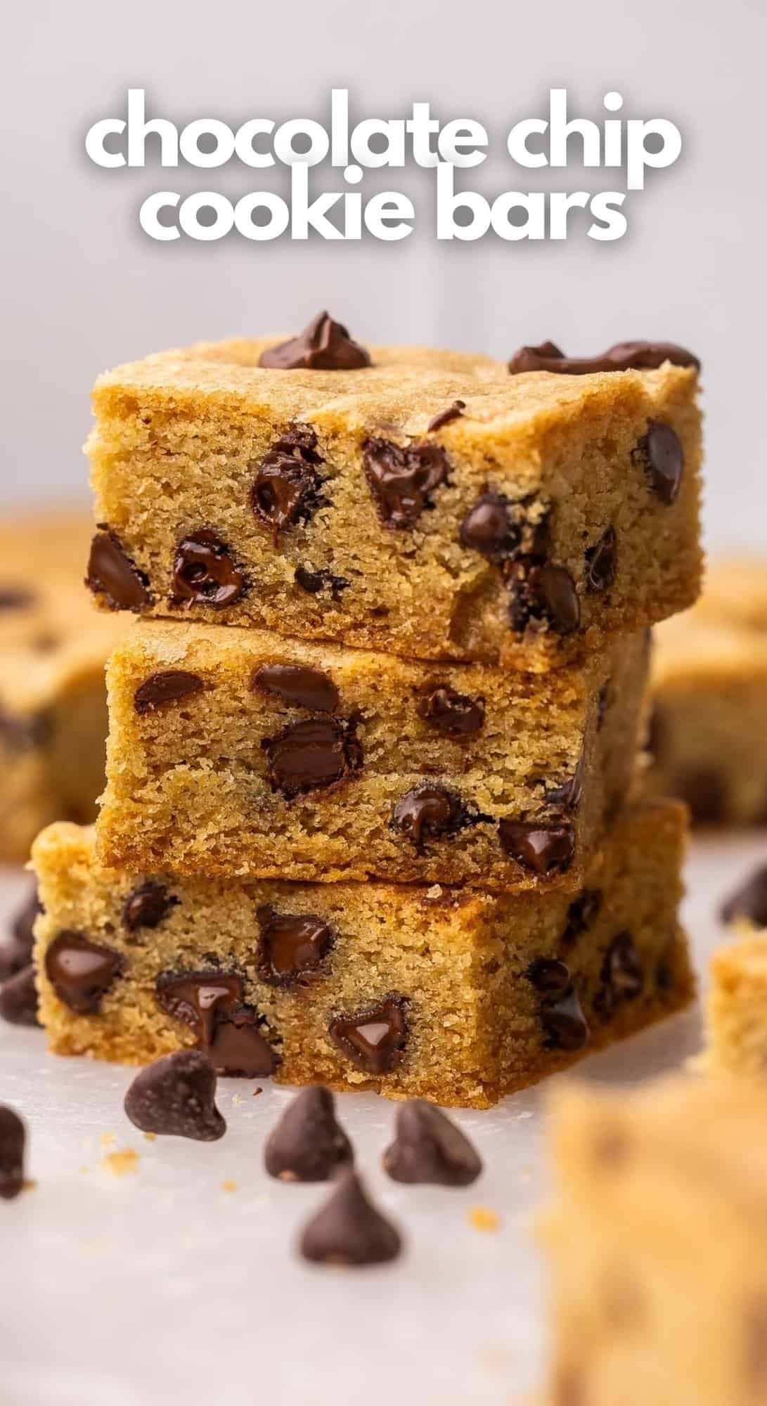 These Chocolate Chip Cookie Bars are soft, chewy chocolate chip cookies in bar form! They’re easy to slice and only take 30 minutes to make.