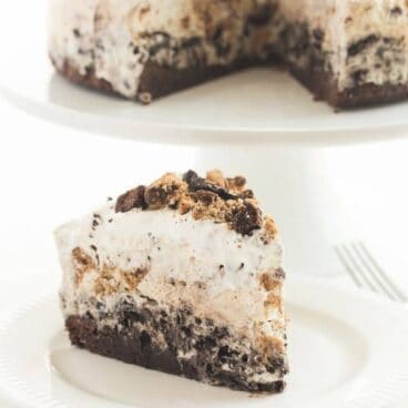So call it what you will, but we have one super fudgy brownie base (use my recipe or your own, or a box! The softer and fudgier the better — chewy brownies will get tough in the freezer!), topped with a no churn Oreo ice cream, fudge crumbles, Chocolate Chip Cookie no churn ice cream, and frosted with whipped cream and topped with more cookies!