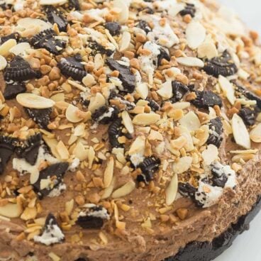 Sometimes you just need a mountain of chocolate! This Chocolate Explosion has rich chocolate mousse piled high on an Oreo crust, filled with chunks of vanilla cheesecake, Oreos, nuts, toffee bits — truly indulgent!
