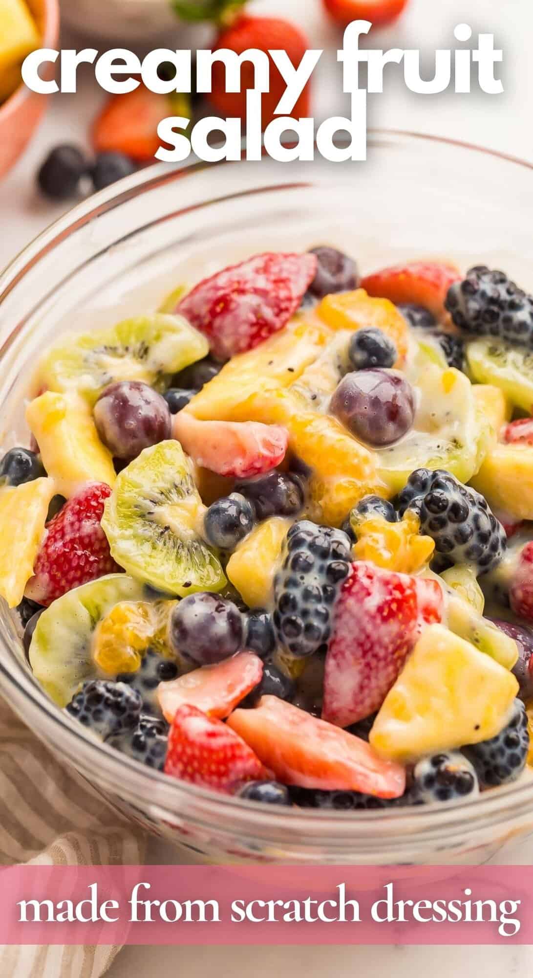 This Creamy Fruit Salad Recipe is made with a Homemade Vanilla Fruit Salad Dressing, plus strawberries, blueberries, oranges, grapes, kiwi and blackberries — no pudding mix here!