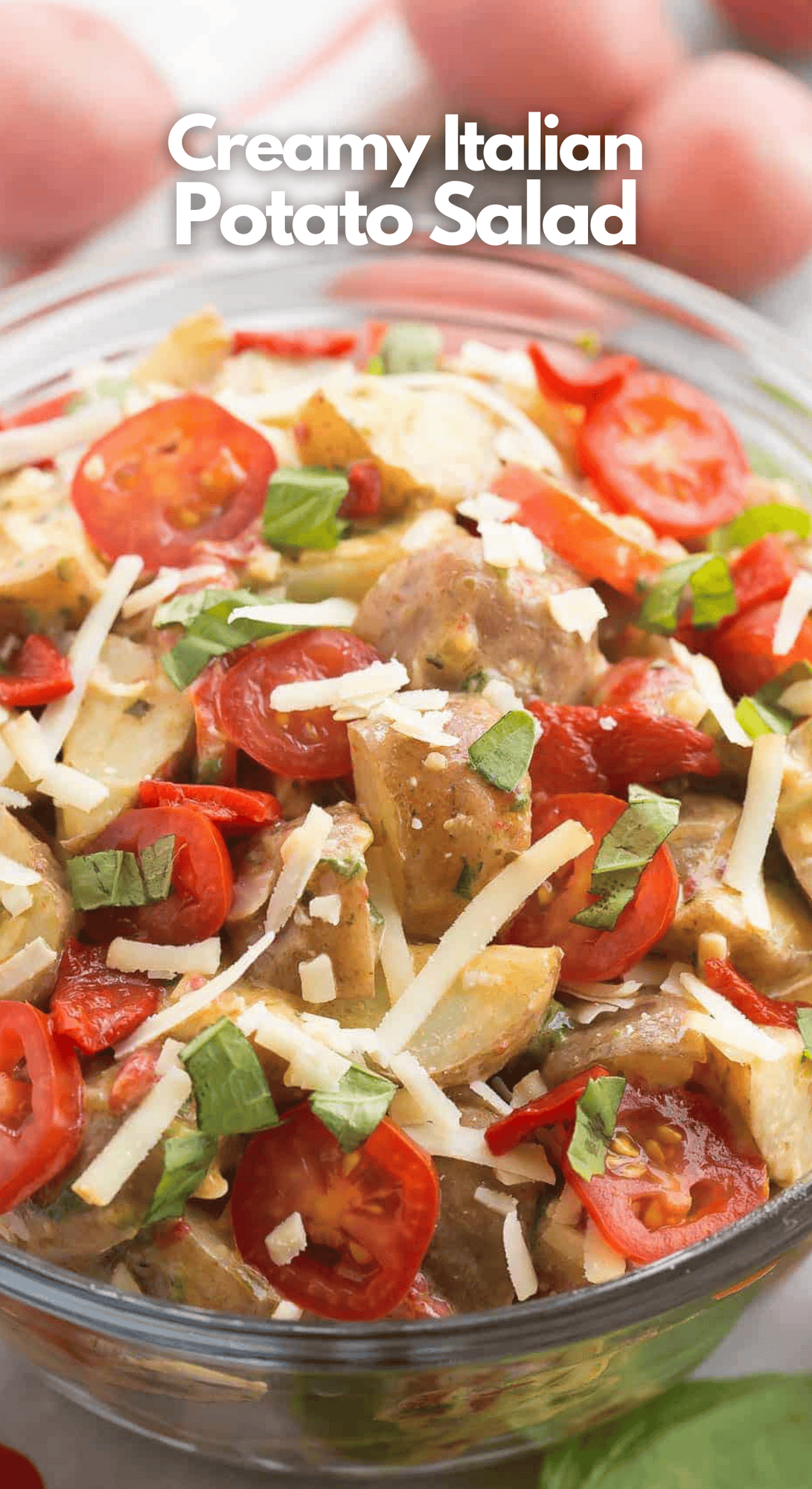 Funny enough, this creamy Italian potato salad has completely won me over. It’s a perfect middle ground between a classic mayo-loaded potato salad and a light vinaigrette, packed with healthy, flavorful ingredients like roasted red peppers, spinach, pesto, Parmesan cheese, and grape tomatoes.