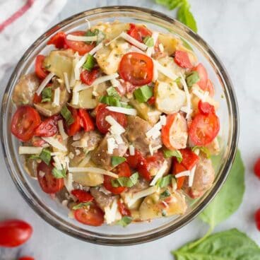 A fun new twist on classic Potato Salad! This Creamy Italian Potato Salad is filled with spinach, pesto, tomatoes, roasted red peppers and Parmesan cheese, it’s perfect alongside grilled chicken or at any picnic!