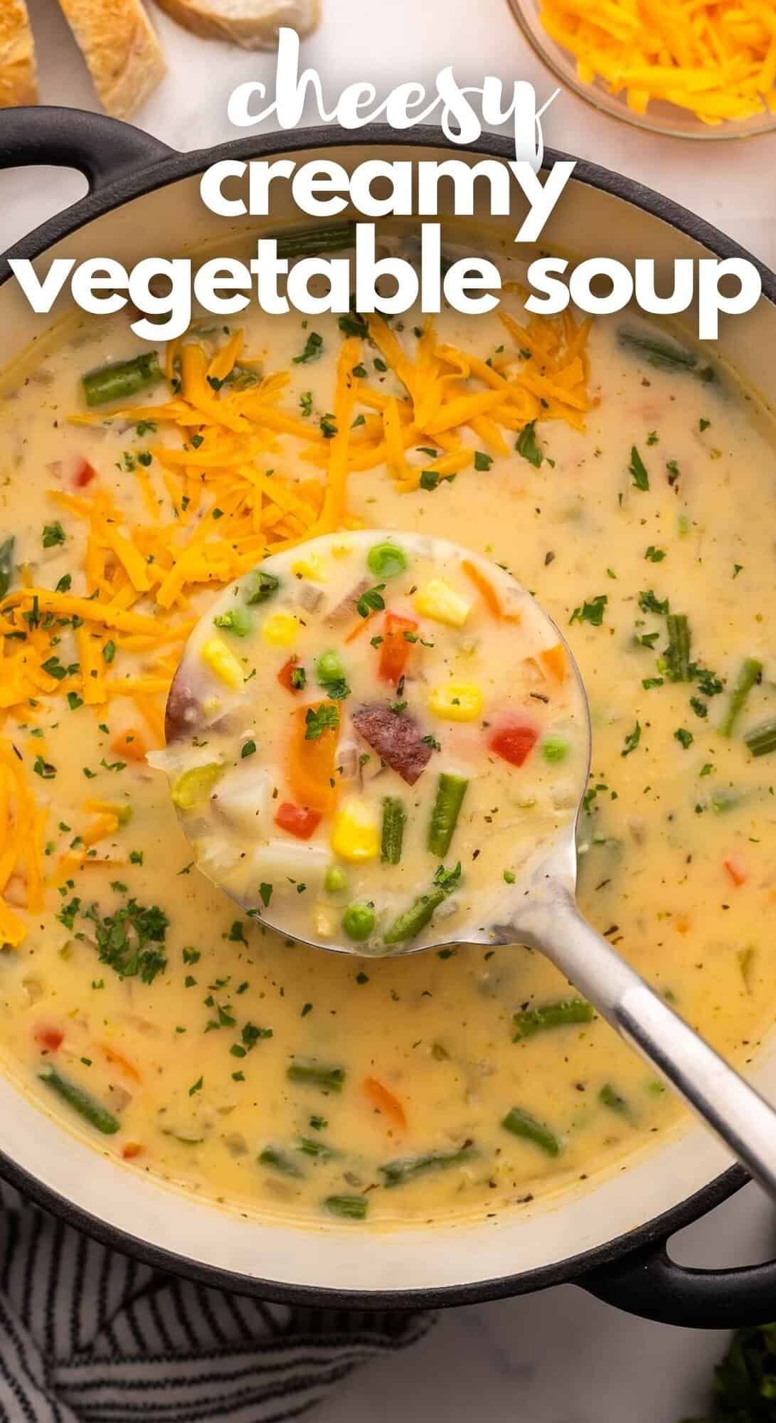 Cozy up with this thick and Creamy Vegetable Soup! Packed with potatoes, carrots, corn, peas, and melty cheddar, it’s a hearty 30-minute dinner the whole family loves (and our favorite way to eat our vegetables!).
