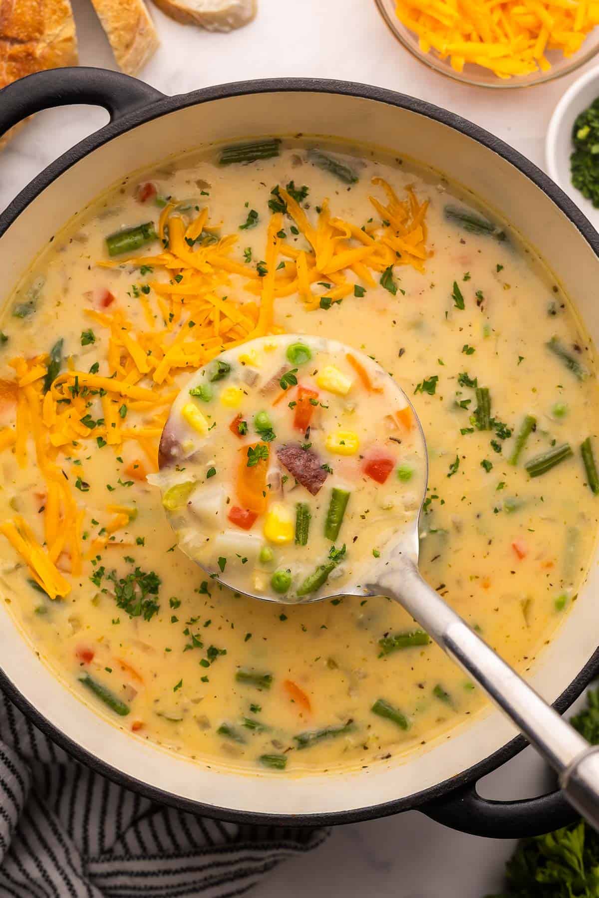 Cozy up with this thick and Creamy Vegetable Soup! Packed with potatoes, carrots, corn, peas, and melty cheddar, it’s a hearty 30-minute dinner the whole family loves (and our favorite way to eat our vegetables!).