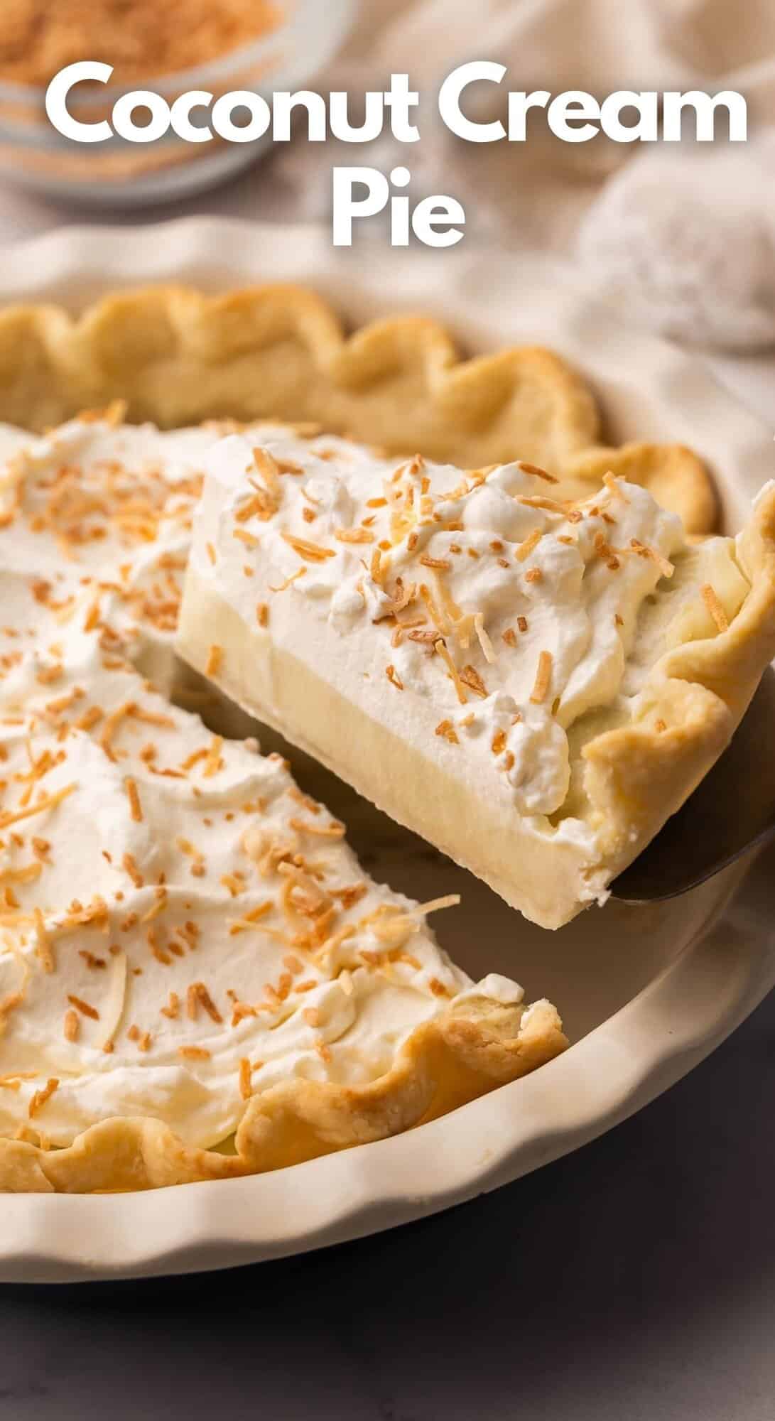 Store Coconut Cream Pie covered in the fridge for up to 2 days for the best texture. The crust softens the longer it sits, so I like to add whipped cream and toasted coconut right before serving.