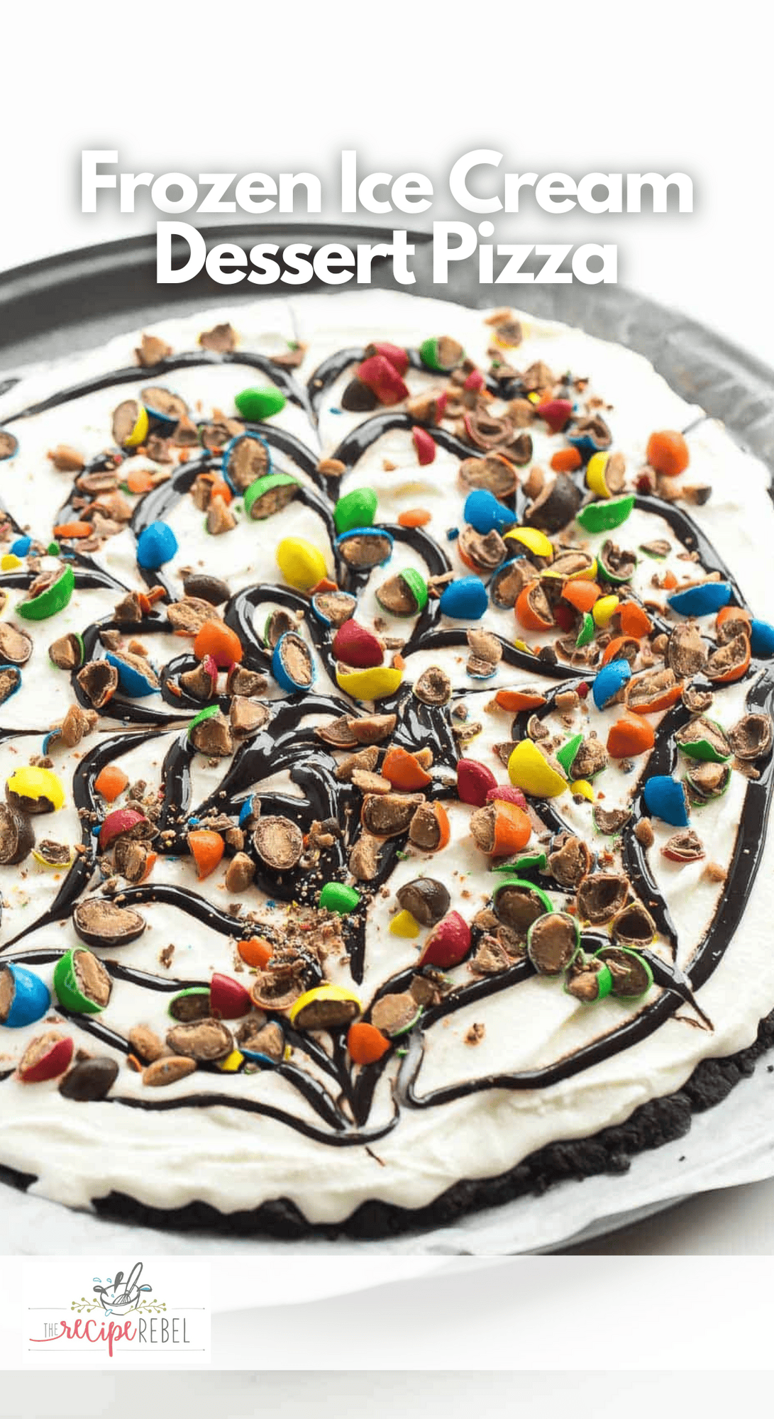 This Frozen Ice Cream Dessert Pizza is THE no-bake summer dessert you need! A Dairy Queen Copycat Treatzza Pizza, it has an Oreo fudge crust topped with ice cream, fudge sauce, and M&M’s. Only 4 ingredients, super customizable, and done in 20 minutes max!