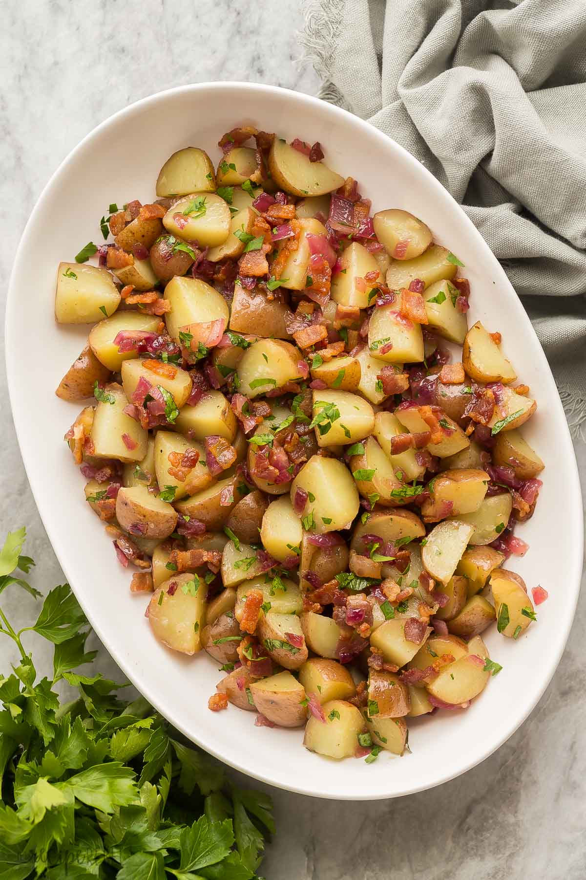 It’s made with boiled red potatoes, crispy bacon, and a homemade vinaigrette comprised of apple cider vinegar, bacon drippings, (many add Dijon mustard, but it’s not our favorite) and I love adding a sprinkling of fresh chopped parsley or green onions.