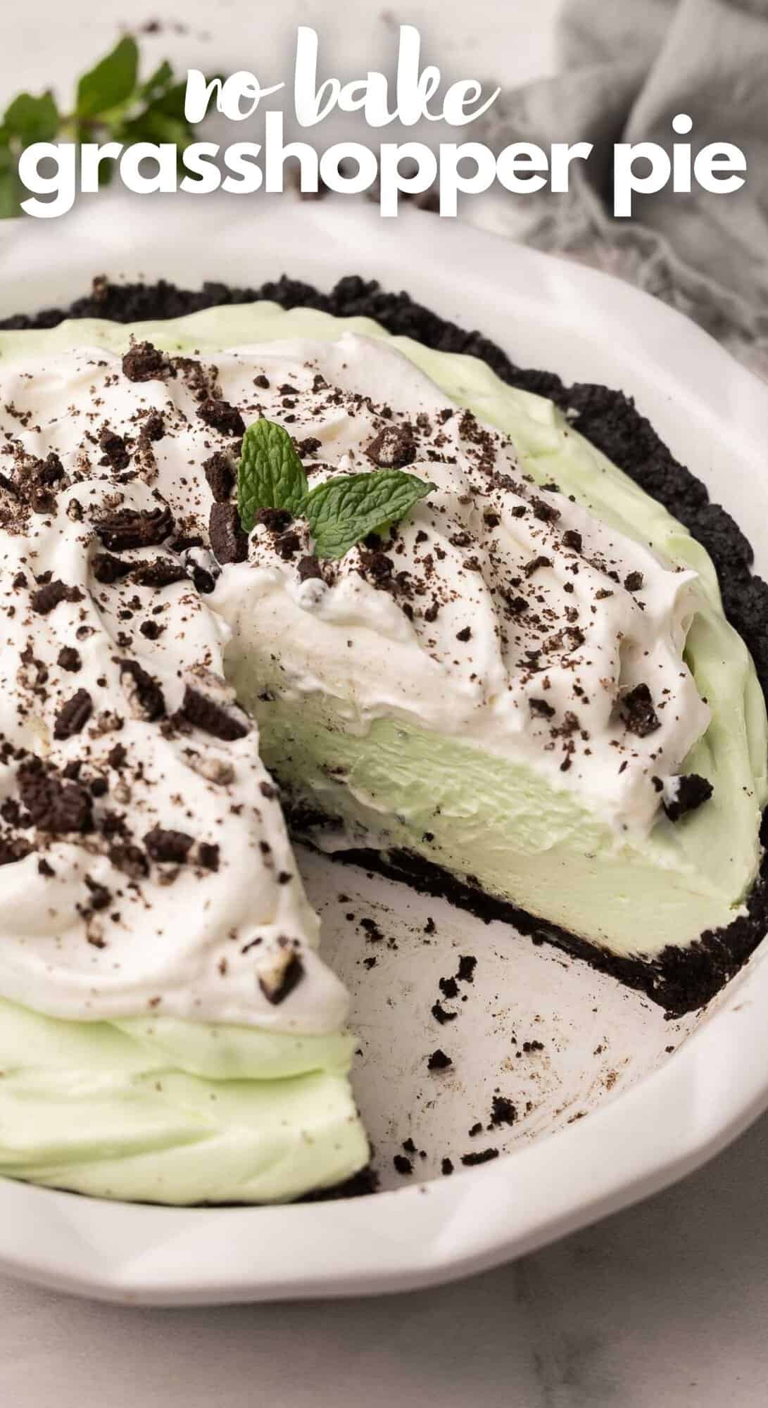 This Grasshopper Pie is a creamy, minty no-bake dessert with a chocolate cookie crust, creamy mint filling, and whipped cream topping. Make-ahead, freezer-friendly, and perfect for the holidays or any time in between!