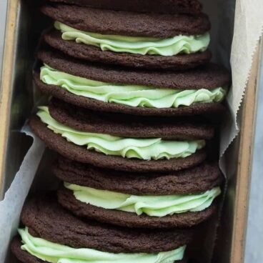 Growing up, we had homemade Oreos all the time, and they were a lot like this (minus the mint spin, of course) — they had a large, thin, chewy chocolate cookies but they were filled with cream cheese frosting. I’m pretty sure they were my favorite cookie when I was younger (I mean, I certainly wouldn’t turn a batch down today….).