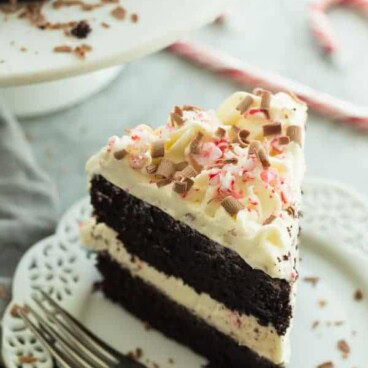 This Layered Double Chocolate Peppermint Cake has two super fudgy cake layers, a white chocolate whipped cream frosting and is loaded with crushed candy canes and chocolate shavings! This is THEE Christmas dessert!