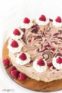 An easy ice cream cake made 3-ingredient no-churn chocolate ice cream swirled with Nutella and raspberry preserves. All on a crust made with crushed ice cream cones! The perfect simple, no-bake summer dessert!