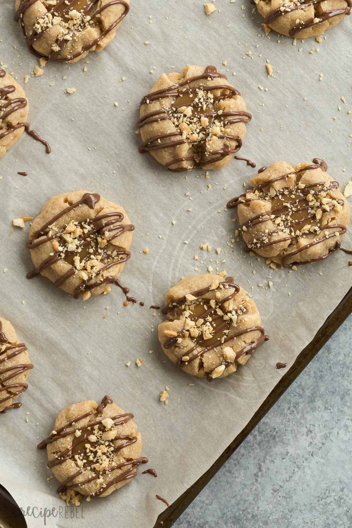 And because we are starting with a peanut butter base, we’re taking things up a notch! These peanut butter turtle thumbprint cookies have a super simple caramel filling, a chocolate drizzle and a sprinkling of chopped peanuts.