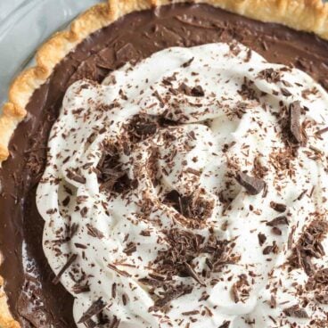 This easy French Silk Pie is made with a fluffy, rich chocolate filling and easy homemade pie crust, topped with sweetened whipped cream and chocolate shavings. Easier than most, and no raw eggs!