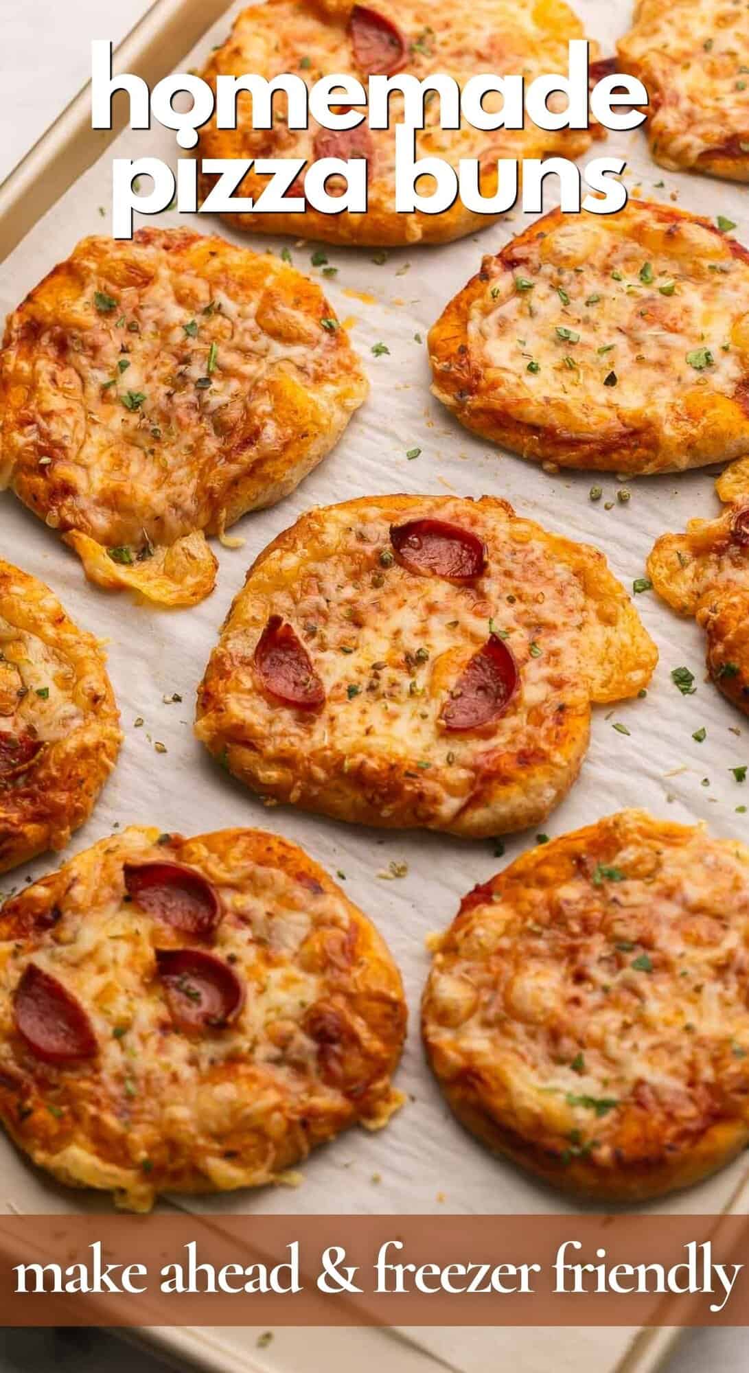 - Let cool to room temperature. Fill a baking sheet with pizza buns, making sure they are not touching. Freeze for 1 hour until firm, then place in large freezer bags. Return to the freezer for up to 3 months.