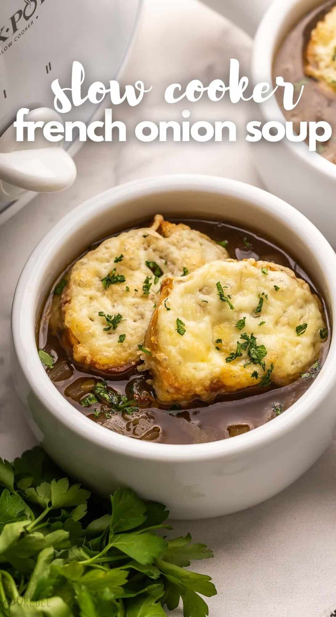 This Slow Cooker French Onion Soup is loaded with caramelized onions, a rich broth, and topped with crusty bread and melty cheese! It’s just like the classic version with a more hands-off approach for busy days.