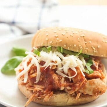 - Cook on low for 4-6 hours. Shred chicken and serve on a bun with shredded cheese and fresh basil if desired.