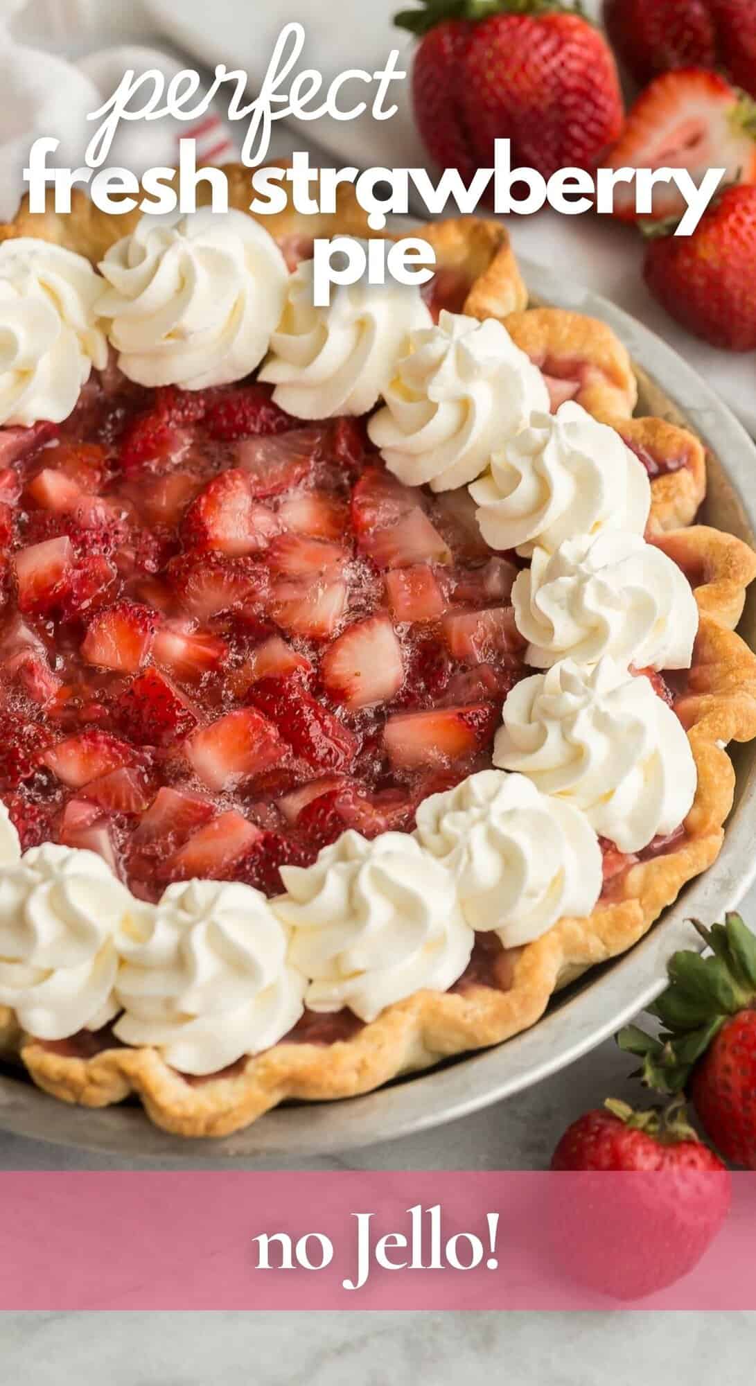 This fresh Strawberry Pie is made with real strawberries and no Jello mix in a homemade pie crust, topped with sweetened whipped cream! It’s the perfect summer treat!