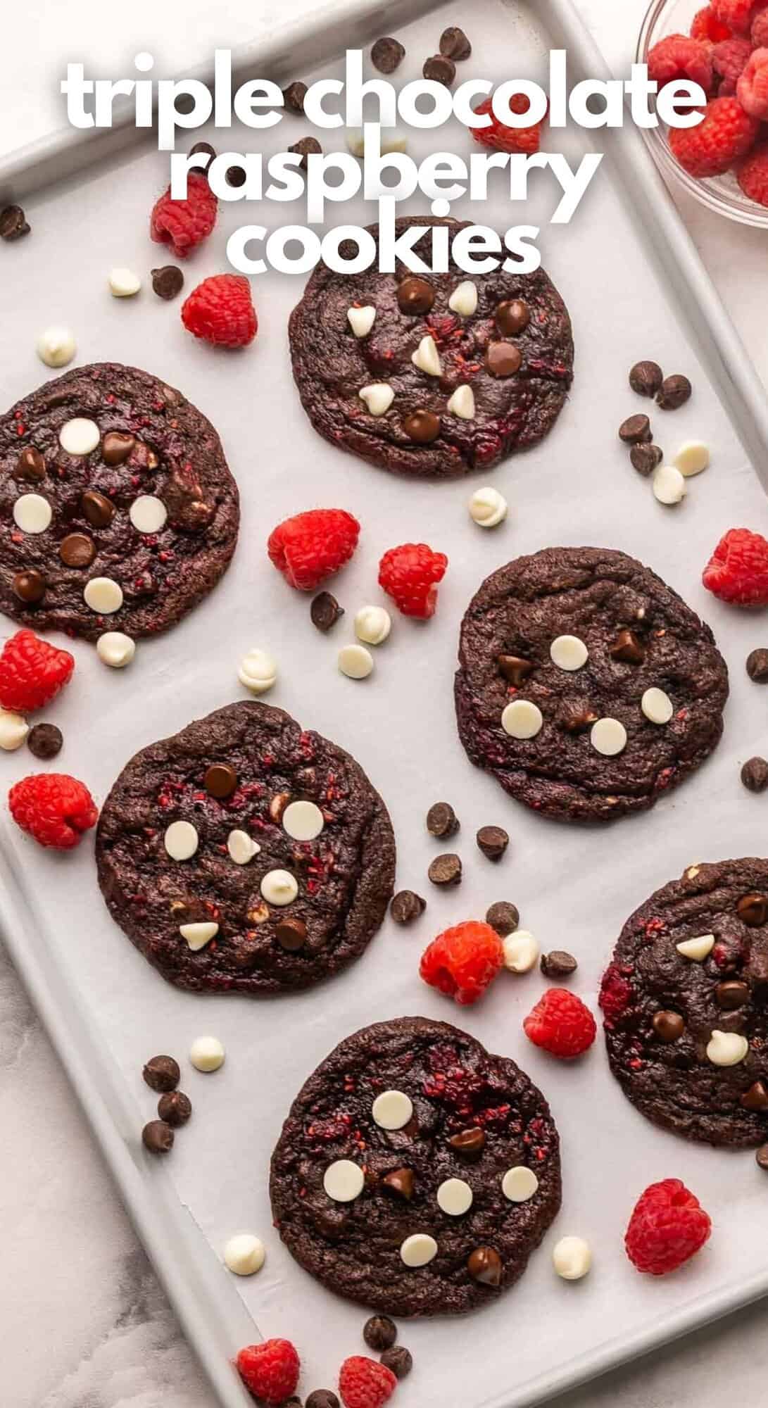 These Triple Chocolate Raspberry Cookies are made with double chocolate cookie dough, white chocolate chips, and tart raspberries! They’re chewy, fudgy, and a little fruity, perfect for when you feel like changing things up.