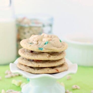These White Chocolate Lucky Charms Cookies are perfectly chewy and made with Lucky Charms cereal and marshmallows. Perfect for St. Patrick’s Day! Includes step by step recipe video